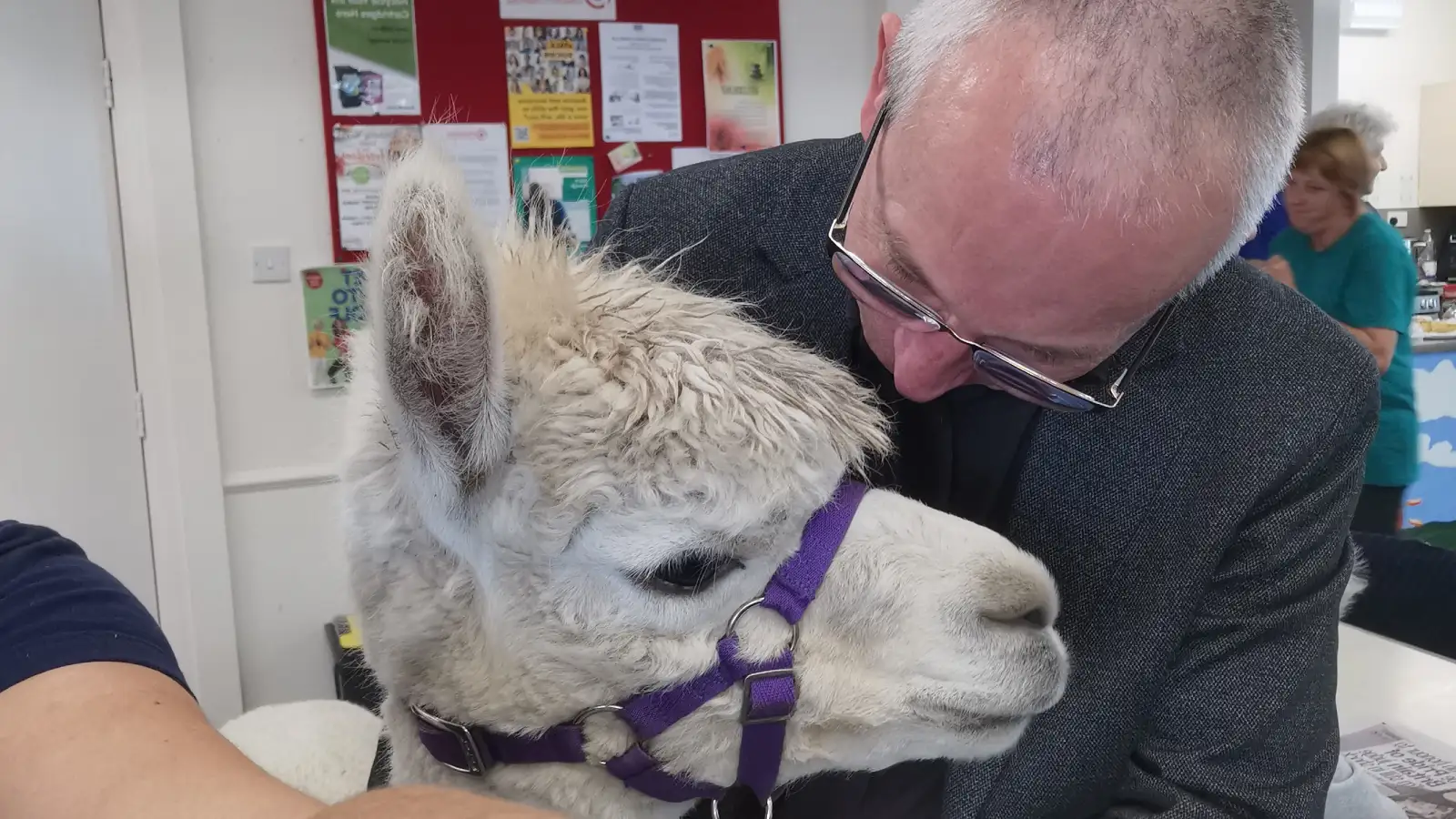 A warm scene from the alpaca visit at the Stafford & District Stroke Club. A club member and author of this blog stands beside a gentle white alpaca wearing a purple halter, holding a smartphone mounted on a stabilizer. The colourful mural in the background adds to the friendly, welcoming atmosphere of this special event.
